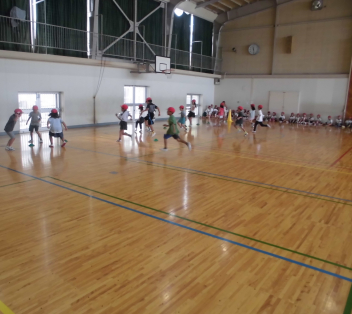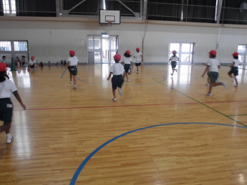 流れる音に合わせて一生懸命に走り、見ている子は頑張っている友達を応援していました。