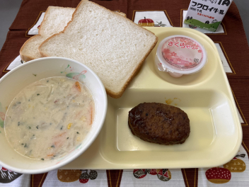今日は「入学・進級祝い」の行事食でした 入学した1年生のみなさんと進級した2年生以上のみなさんをお祝いして、人気メニューの「ハンバーグ」と春らしい「さくらゼリー」を取り入れました。