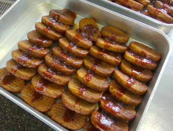 ハンバーグは大きな釜にきれいに並べ、ケチャップ、ソース、赤ワインなどを合わせて作ったタレと一緒にじっくりと煮込みましたlaugh