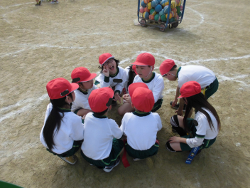 チームで集まって、作戦を考えています。「どうやったら守れるかな?」「『せーの』」って言ってみんなで同時に行こう。」