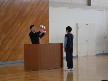 児童代表として6年生の児童が、校長先生から教科書をいただきました。