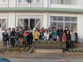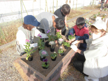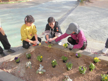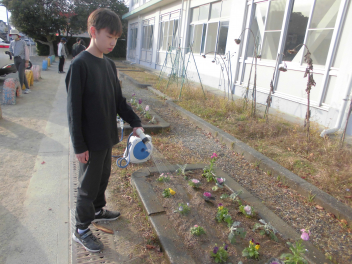 美化委員会では、年に2回、校舎南側と正門前の花壇の植え替えをしています。今回は、パンジーや葉牡丹など、冬の植物を植えました。