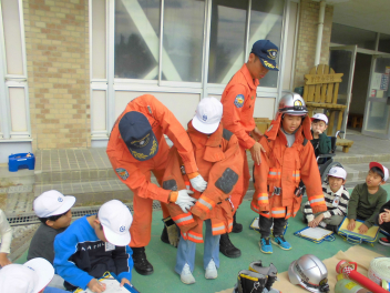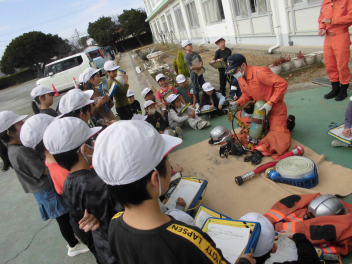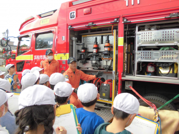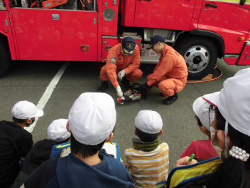 救助車やポンプ車、消防士の道具を見せていただき、大変勉強になりました。