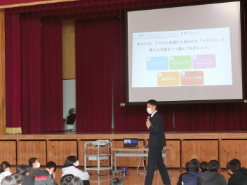 • 今週は学校保健週間です。5時間目に、新津小中合同学校保健委員会が新津中学校で開催されました。新津小を代表して、6年生が参加しました。青少年育成センターの袴田剛先生を講師にお招きし、「楽しいコミュニケーションを考えよう」の演題で講話をしていただきました。