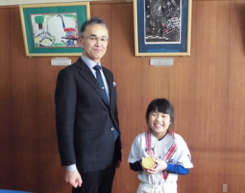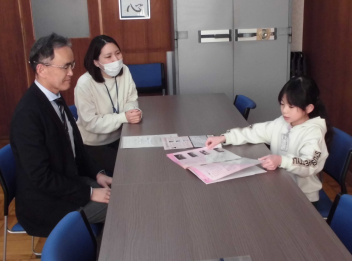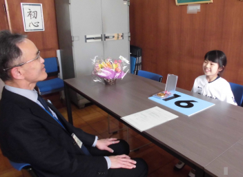 新津小の2年生の子供が、テレビ番組に出演し、よい成果を収めたことを校長先生に報告しました。