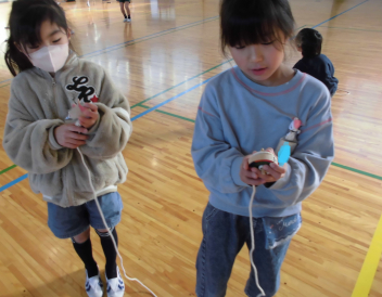 新津小の1年生の子どもたちは、生活科の「ふゆをたのしもう」の学習で、伝承遊びに挑戦しています。こま回しでは、自分で色を塗ったこまを使い、何度も練習を重ねました。少しずつ回せるようになり、冬の遊びの楽しさを感じている様子でした。