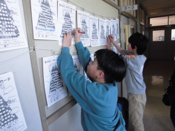 算数「九九の表」の単元です。九九表の中に同じ答えを見つけ、印をつけています。「同じ答えが2つあるよ。」「3つある数もあるね。」「4つあるのは、12と24と・・・」とつぶやきながら探しています。