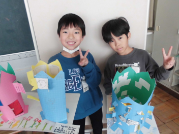 カッターナイフタワーが完成しました。窓をのぞくと、かわいい絵が見えます。明日の参観会で、楽しみにご覧ください。