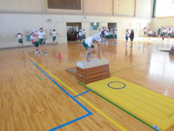 開脚飛びやかかえこみとびの練習をしました。難しい技に進んで挑戦しました。