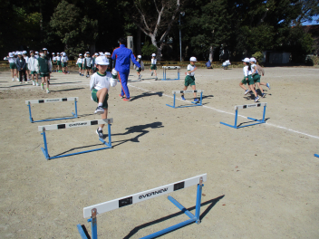 選手の動きをもとに、ハードルで足の動かし方を実践しています。