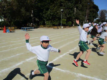 体育「ボール運び鬼」では、ボールを運んで得点にしたり、腰に付けたしっぽをとったりして、たくさん体を動かしています。