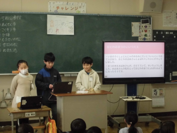 •  2月26日(木)。3年生は今月、総合で新津の地域について学んだことを2年生に発表しました。