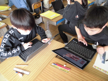 図工「すきまちゃんのすきなすきま」では、すきまちゃんが過ごせるような場所を探し、タブレットで写真を撮る活動をしました。