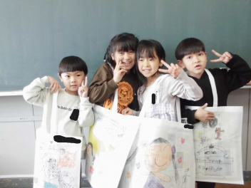 新津小の1年生の子供たちは、図工の作品を入れる作品バッグに好きな絵を描きました。