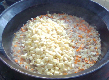 豚肉、たまねぎ、にんじんを炒め、じゃがいもを合わせてじっくりと煮ました。