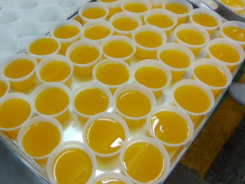 デザートのみかんゼリーは、給食室の手作りでしたsad みかんジュースに寒天と砂糖を加えて溶かし、1個ずつカップに注ぎました。