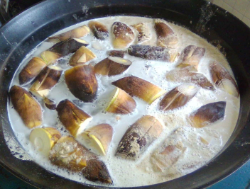 「たけのこ」はアクが強く、えぐみという苦みがあります。給食室では、前日に米ぬかと一緒に「たけのこ」を茹でてアク抜きをしましたlaugh