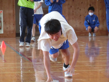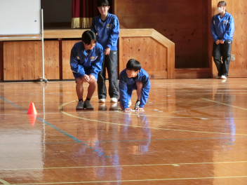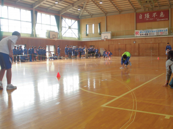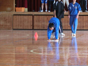 昼休みの時間を使って、団対抗雑巾がけリレーが行われています