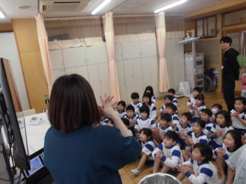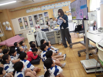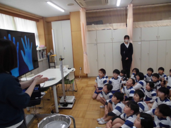 測定をする前に、養護教諭から、手の正しい洗い方について話を聞きました。手の汚れが落ちているかを確認する実験を行い、石鹸を使って指の間や爪まで丁寧に洗うことが大切であると知りました。早速、給食の前や掃除の後などに、教えてもらった手洗いを実践しました
