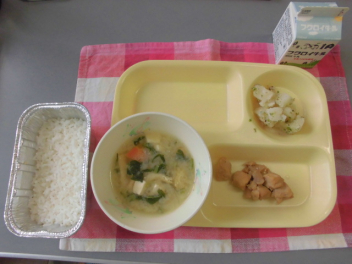 今日の献立は、ごはん 牛乳 鶏肉のさっぱり煮 じゃがいもの香味あえ みそ汁 です。