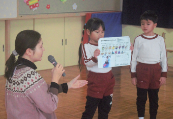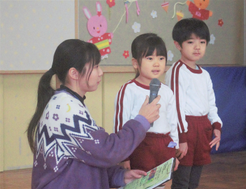 3学期の始業式は、園歌を歌い、先生方の話を聞いて、各学年の代表の子が、冬休みの楽しかったことを発表しました。