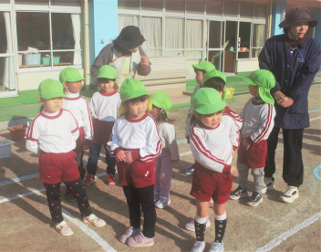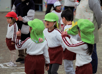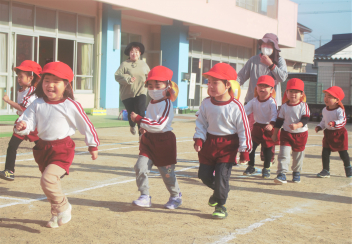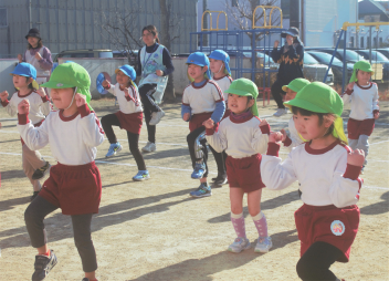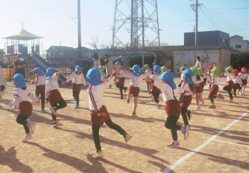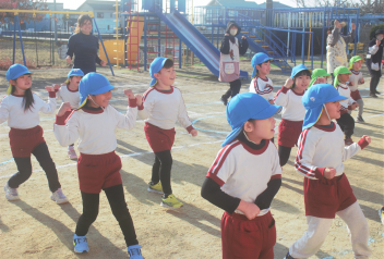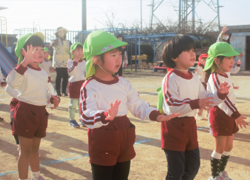準備運動の「赤おにと青おにのたんご」と「おにのパンツ」を、みんな笑顔で楽しんでいます。
