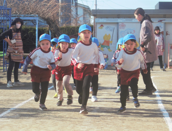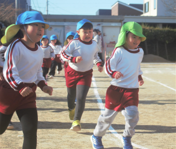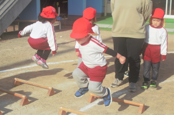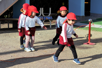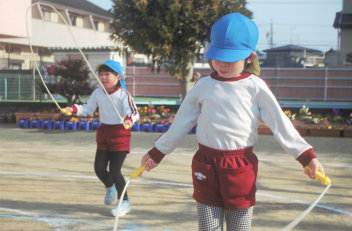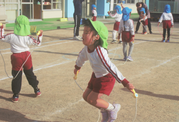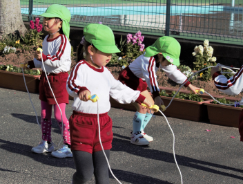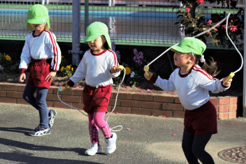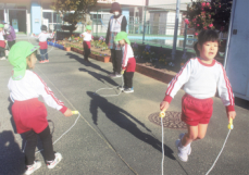 マラソンが終わった後は、年少さんはミニハードルでジャンプ !  年中さんと年長さんは縄跳びにチャレンジです。