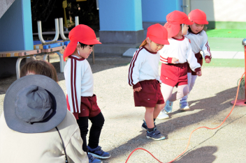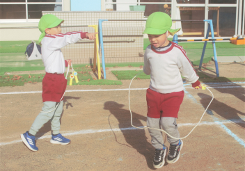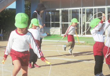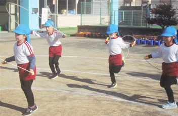 年長さんは、縄跳びのいろいろな跳び方にチャレンジする子が増え、交差跳びや後ろ回しなどに取り組んでいました。