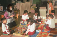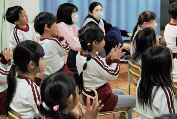 「春・夏・秋・冬なにしてる?」は扇子や傘やたびなどを使い日本の四季を面白おかしく表現してくれました。途中の遊びでは年長さんが参加しました。