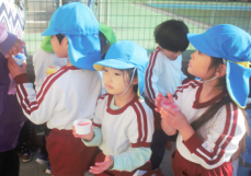 今朝、プールに氷が張っていたので、担任の先生が子供たちのために登園前に取っておいてくれました。年長さんは氷に触ってみました。「冷たい!」と最初はためらっていましたが、カップに氷や絵の具を入れてかき氷づくりを楽しそうにしていました。この時期にしかできない遊びなので機会を逃さず関わって遊べるようにしていきたいと思います。