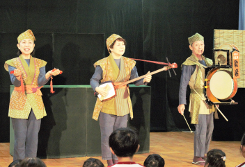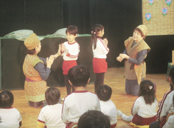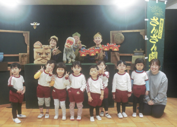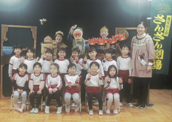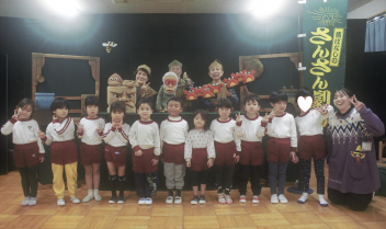 「さんさん劇場」さんに来ていただき、「春・夏・秋・冬なにしてる?」と「さるかにばなし」をみんなで見ました。