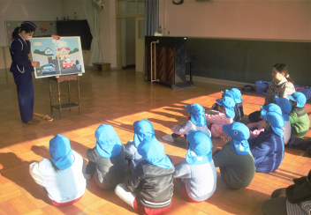 部屋の中で交通ルールについて確認をした後、年少・年中はグループで実際の道路を交通ルールを守って歩いてみました。