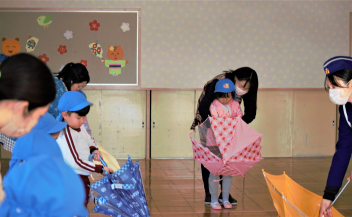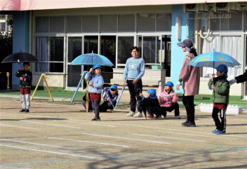 年長さんは、交通ルールを確認すると共に、傘をさして歩く時の注意点を教えてもらい、実際に園庭で歩いてみました。その後、傘を持って道を歩いて交通ルールを確認しました。