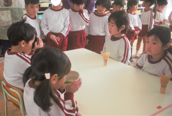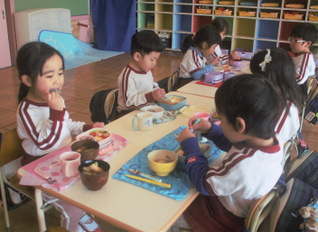 年長組に憧れの気持ちがある年中さんには、年長の先生が来てくれました。年中さん、いつも以上に張り切って食べていました。