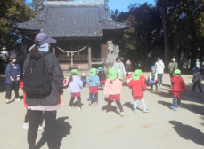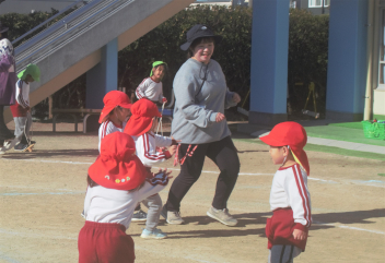 年少さんはみんなでしっぽ取りを行いました。最初は先生がしっぽを付け、2回目は子供たちがしっぽを付けて行いました。