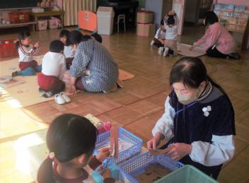 年少さんは、ハサミを使って遊びに必要なものを作ったり、カードや絵合わせ、コマなどを楽しみました。