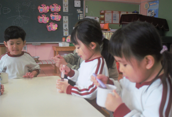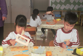 その後は、先生の話を聞いて製作です。みんなきれいに塗ろうと、色塗りに集中していました。