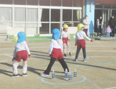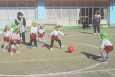 年中さんはみんなで転がしドッジを行いました。ボールに当たらないようにうまく逃げられたかな…?