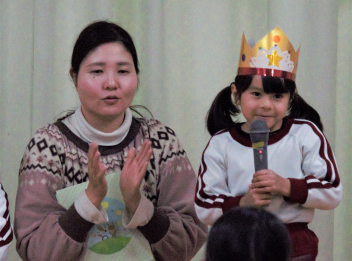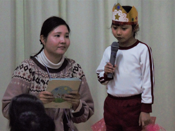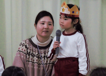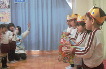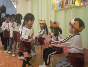 今日は2月の誕生会を行いました。司会は年長さんに教えてもらいながら、年中さんがしました。