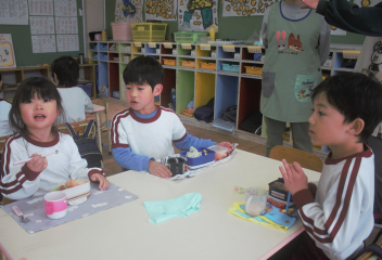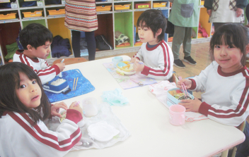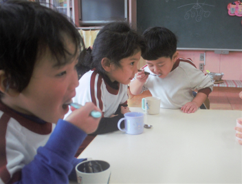 支度が終わって室内で遊んだ後、年少さんはおやつでフルーチェを食べました。子供たちは「おいしい」と大喜びでした。