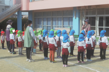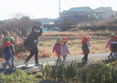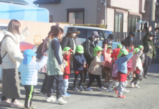 年中さんがリーダーとなって、年少さんを連れていきます。交通ルールをしっかりと守って出発です。