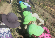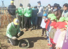 畑の先生にあいさつをした後、じゃがいもの植え方を教えてもらいました。
