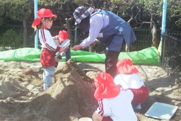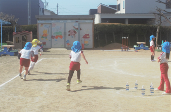 年少さんは遊具や砂場、年中さんは縄跳びや転がしドッジなど、思い思いの遊びを楽しんでいました。