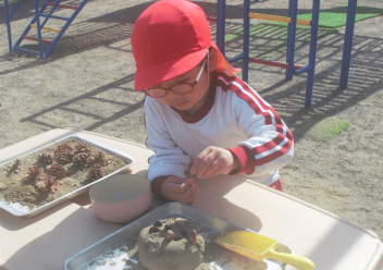 年少さんは思い思いの遊びをしていました。丁寧にドングリを並べてたケーキを作ったり、飲み物を用意してくれたりしていました。