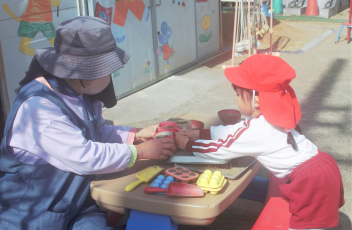 年少さんと年中さんは、絵をかいたり、歌を歌ったり、転がしドッジや遊具などで遊んだりした後、年少さんのクッキー屋さんに年中さんを招待しました。