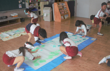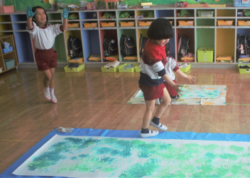 年中さんは壁面の製作です。春に合わせて草原をイメージして作っていました。
