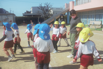 年中さんはみんなでドッジボールの後、思い思いの遊びを始めました。先生と影ふみをして楽しんでいる子もいました。