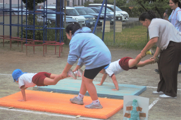 ボール集めゲームや逆上がりにつながるハンドパワー、押し相撲などを楽しく行いました。