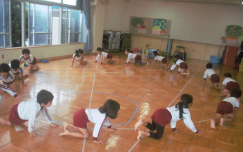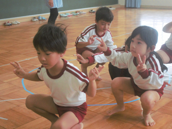 外で遊べなかった年長さん、今日はゆうぎ室で「リトミック」でも体を動かしていました。