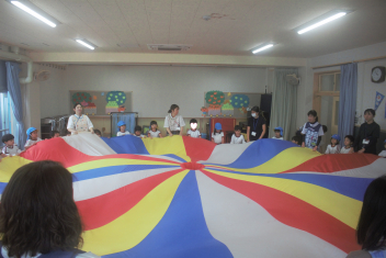 避難訓練が終わった後はみんなで運動会ごっこです。年少さんも初めてのパラバルーンに挑戦、みんな笑顔で楽しんでいました。